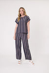 A relaxed summer staple featuring a nautical-inspired stripe in white and mocha on a navy background. Designed with a loose fit and side pockets, the silhouette is both breezy and effortless—perfect for warm weather styling. Crafted from a lightweight cotton-viscose blend for everyday comfort and ease.