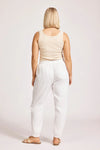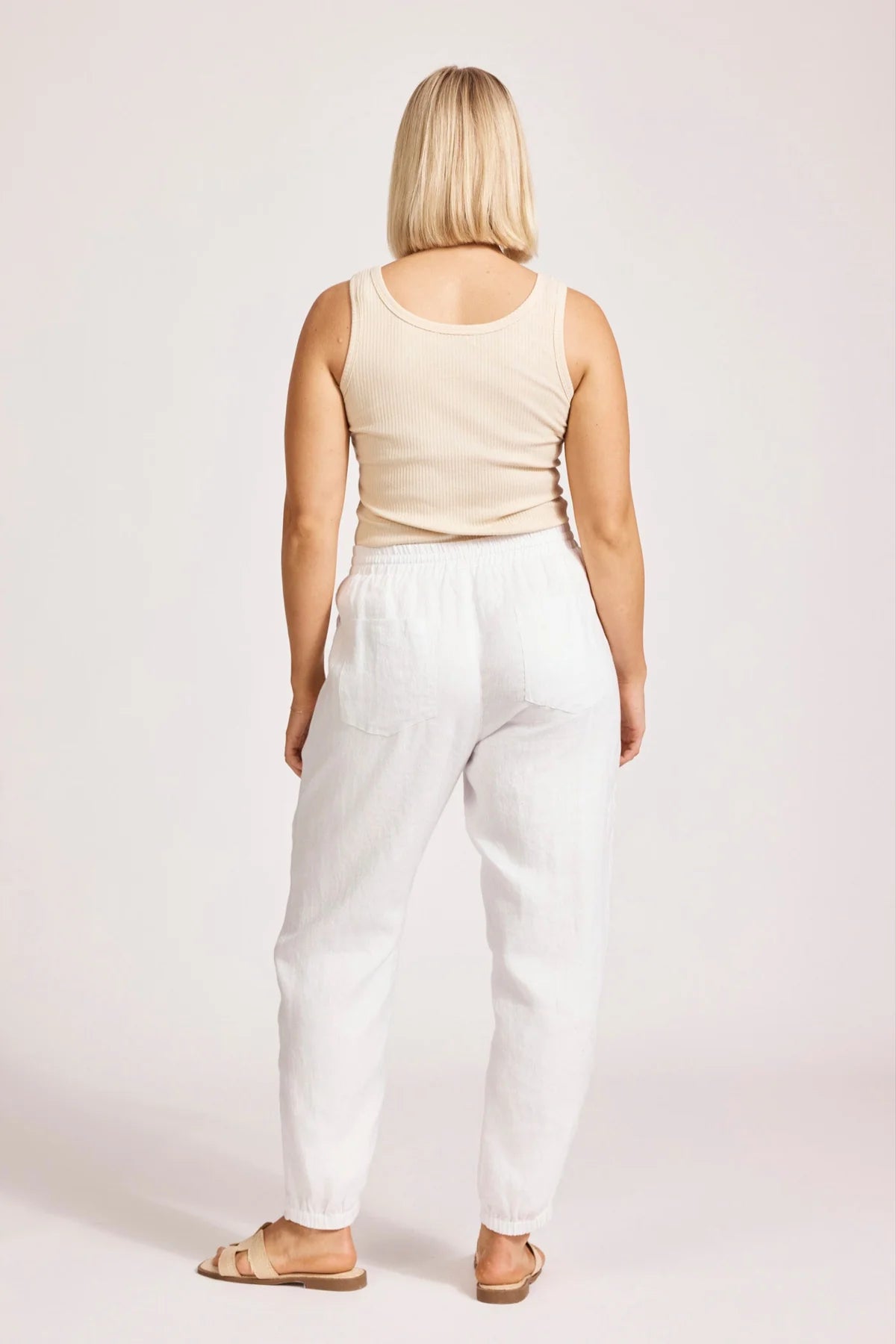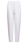 A relaxed jogger-inspired pant designed for effortless everyday style. Crafted from 100% linen for breathable comfort. Features an elasticated drawstring waist, tapered leg, and elastic at the back of the cuff. Side pockets add practicality.