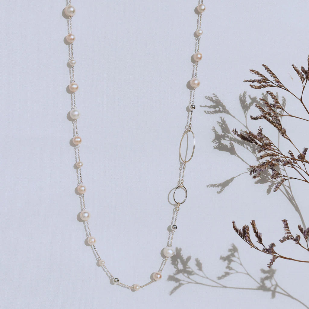 The fresh water pearl long necklace features the classic fresh water pearl in various sizes throughout the necklace. The timeless fresh water pearl is paired with the sterling silver curb chain, silver circle and oval features, as well as intermittent sterling silver beads. The total chain length is 85cm and comes with a 5cm extender chain.