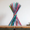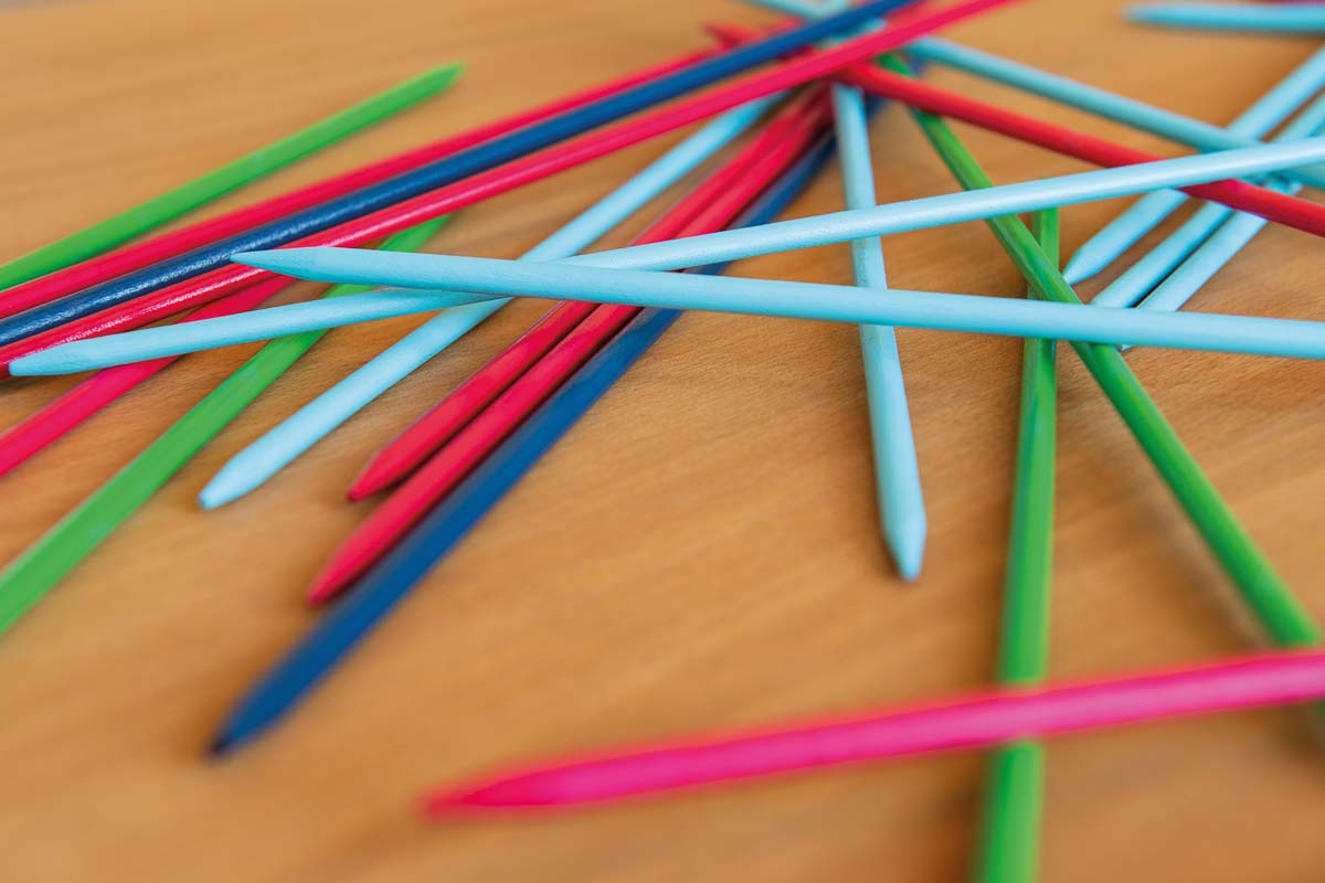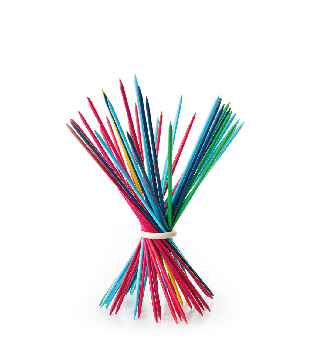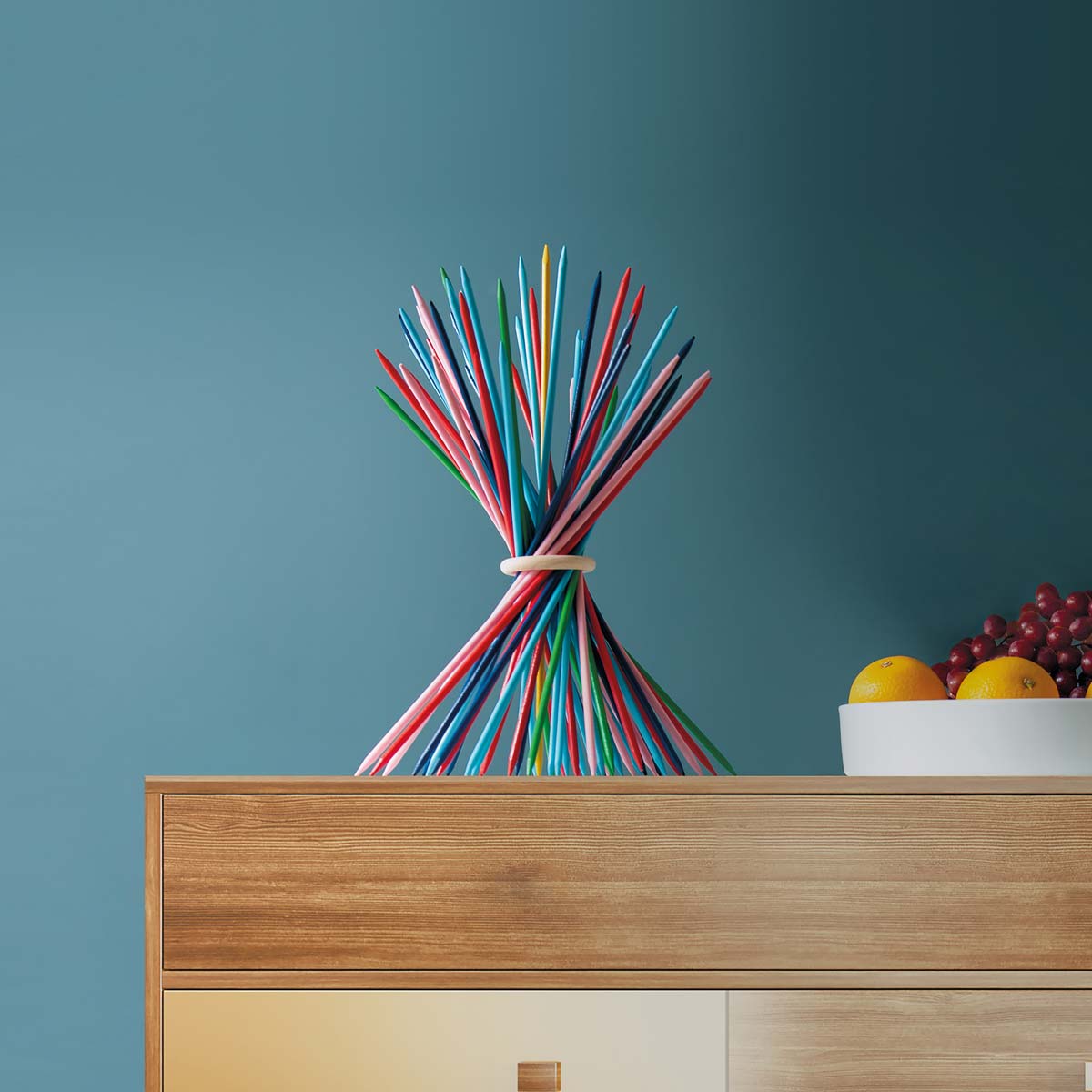 The 50 pine wood sticks are painted in five different colours and can easily be held together with a wooden ring. The sticks can be placed decoratively as a kind of colourful bouquet on a desk or sideboard. Stickado can also be used for the classic skill game Mikado, which tries to pick up one staff after the other without the fallen pile shaking.