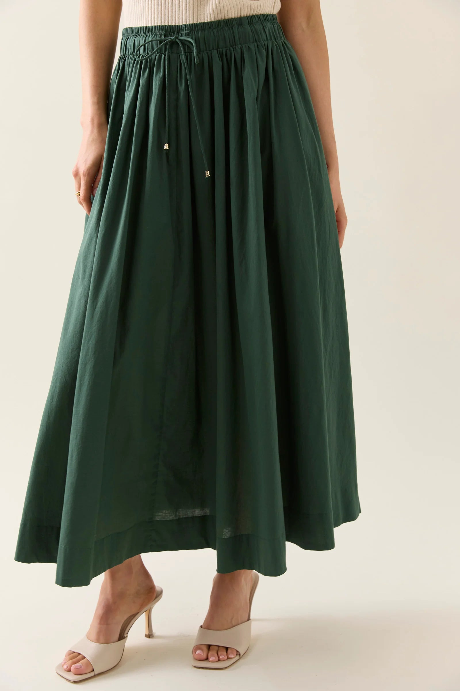 A wide A-line silhouette with beautiful drape, the Aurora Maxi Skirt is crafted from lightweight cotton voile. It features an elasticated waistband and drawstring with gold bead detail, internal side pockets and a wide hem.
