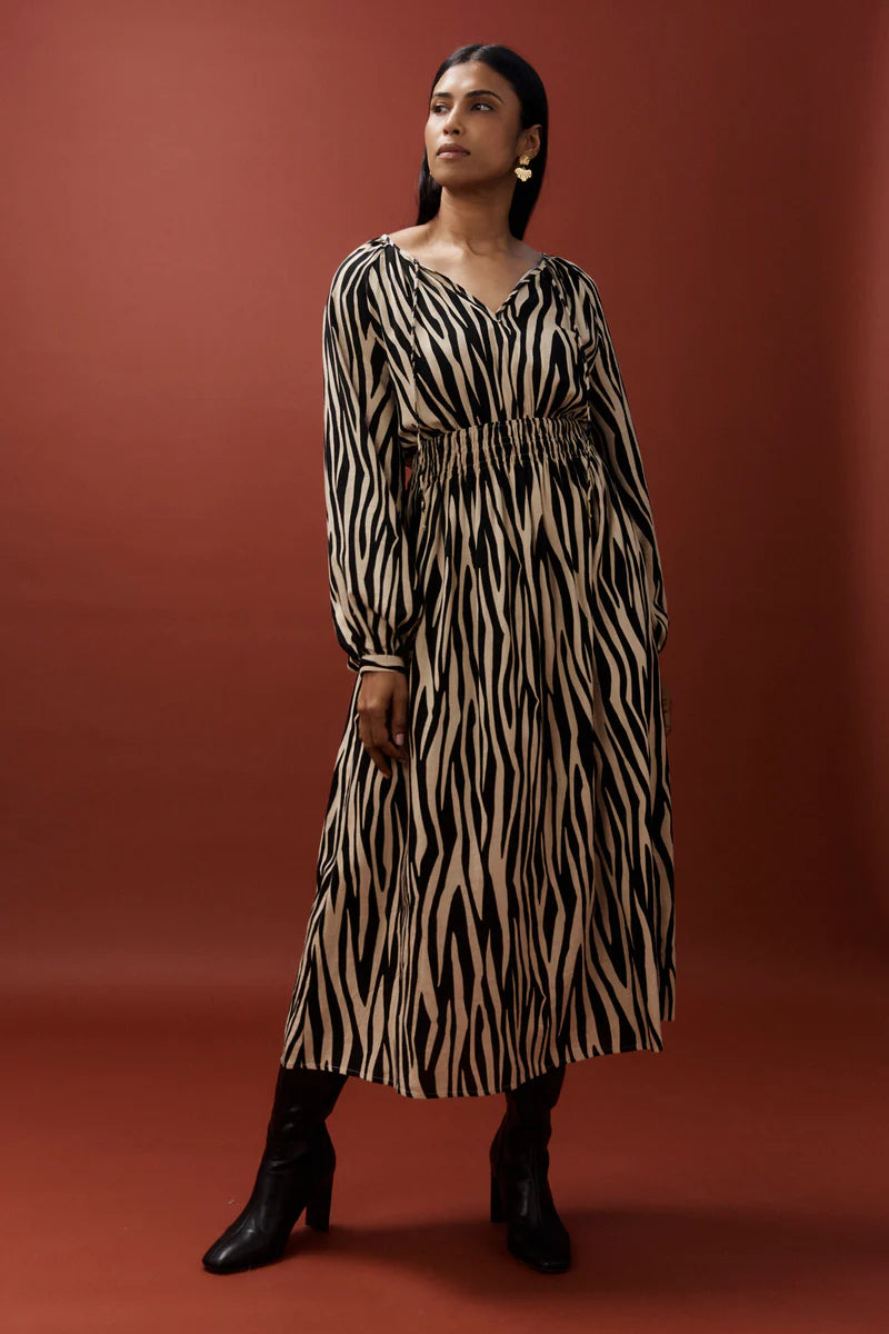 An easy, softly textured maxi dress crafted from a soft-washed subtle statement fabric. This style features a relaxed open neckline with delicate ties, a comfortable shirred elastic waist and an A-line skirt that falls with gentle movement. Finished with pockets for everyday practicality.