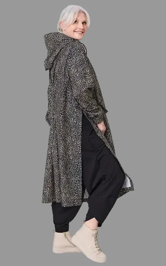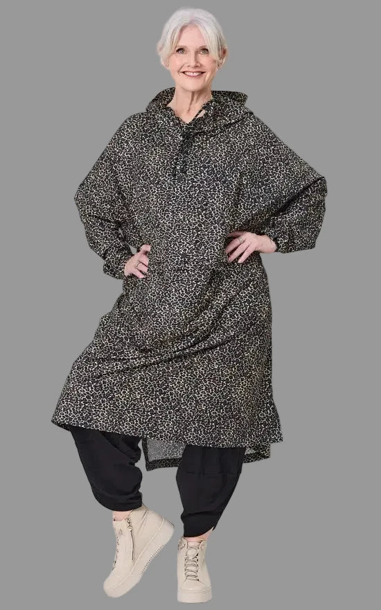 All-over mini-leopard motif, with black trimmings complete the garment.