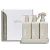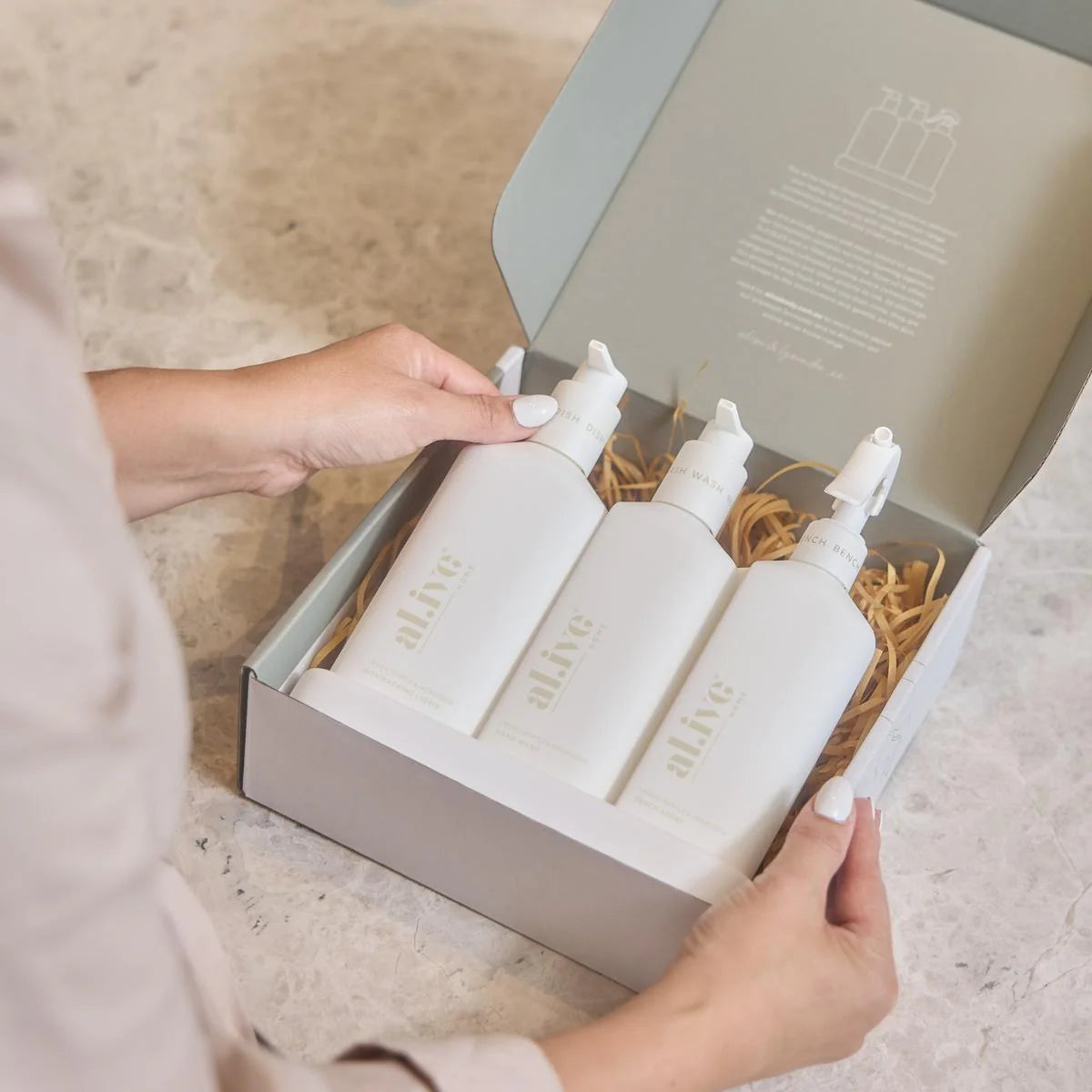 The al.ive body Dishwashing Liquid, Hand Wash & Bench Spray Kitchen Trio is a beautiful yet practical product, elegantly packaged to elevate your countertop.