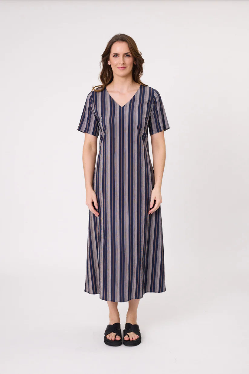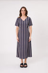 This nautical-inspired dress features white and mocha stripes set against a navy background. With a V-neckline, short sleeves, and a flattering midi length, it’s finished with a gathered waist at the back for added shape. Practical pockets and a cool cotton-rich blend make this both stylish and functional for everyday wear.