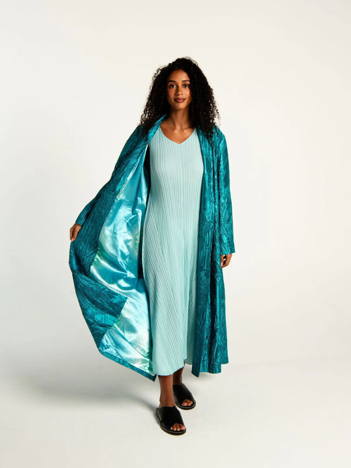 The open front and softly structured collar allow it to drape naturally, balancing sharp tailoring with ease. This is a coat made for layering over pleated dresses or pared-back silhouettes alike.