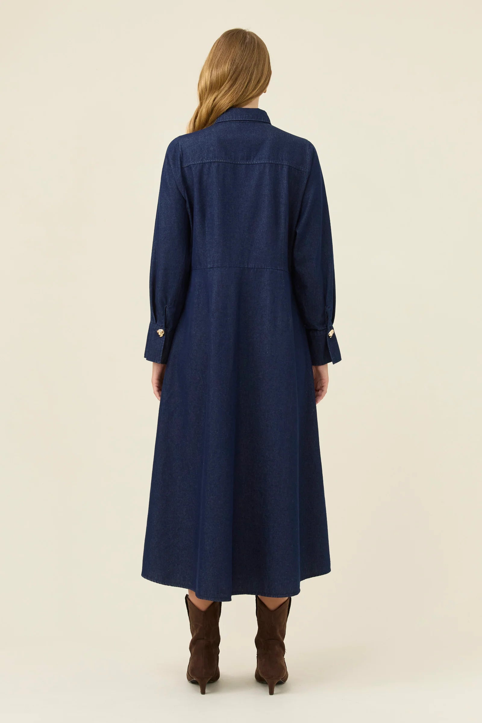 The Sloane Denim Maxi Dress features an empire line shape, statement gold buttons and a softly flowing silhouette designed to sit comfortably off the body.