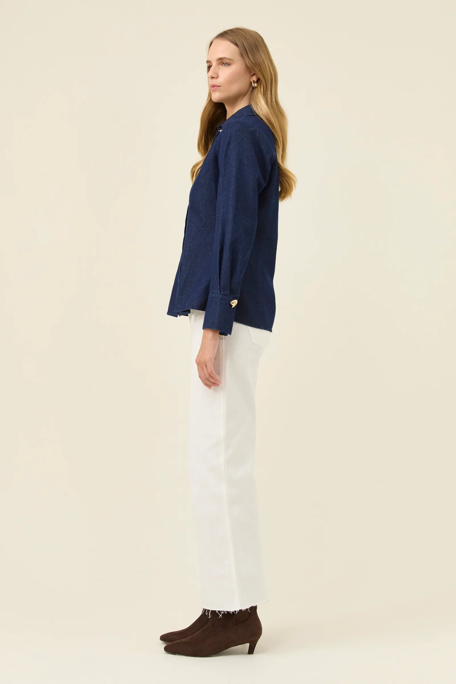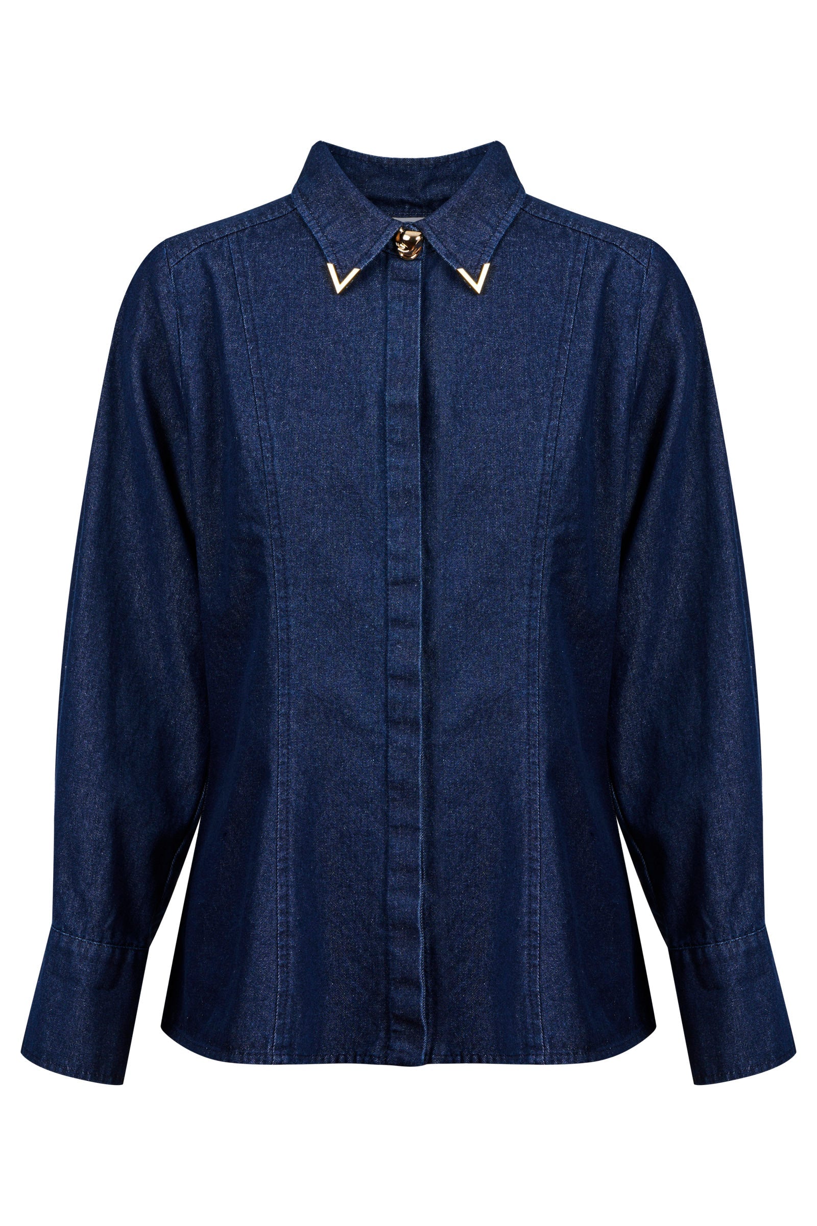 The hidden placket and shaped panel detailing bring a refined finish, while gold-tipped collar trim and statement buttons add a subtle lift.