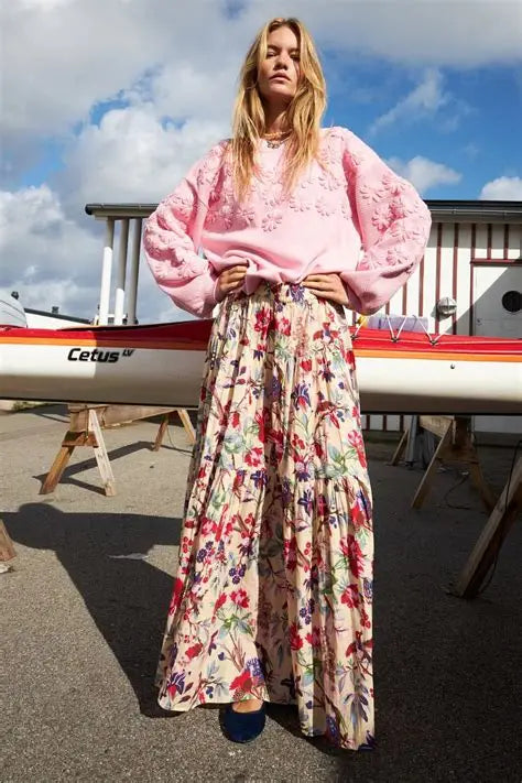 The Sunset skirt is a light and elegant maxi skirt made from 100% cotton, featuring a beautiful drape and a flattering cut that makes it a lovely addition to any wardrobe.