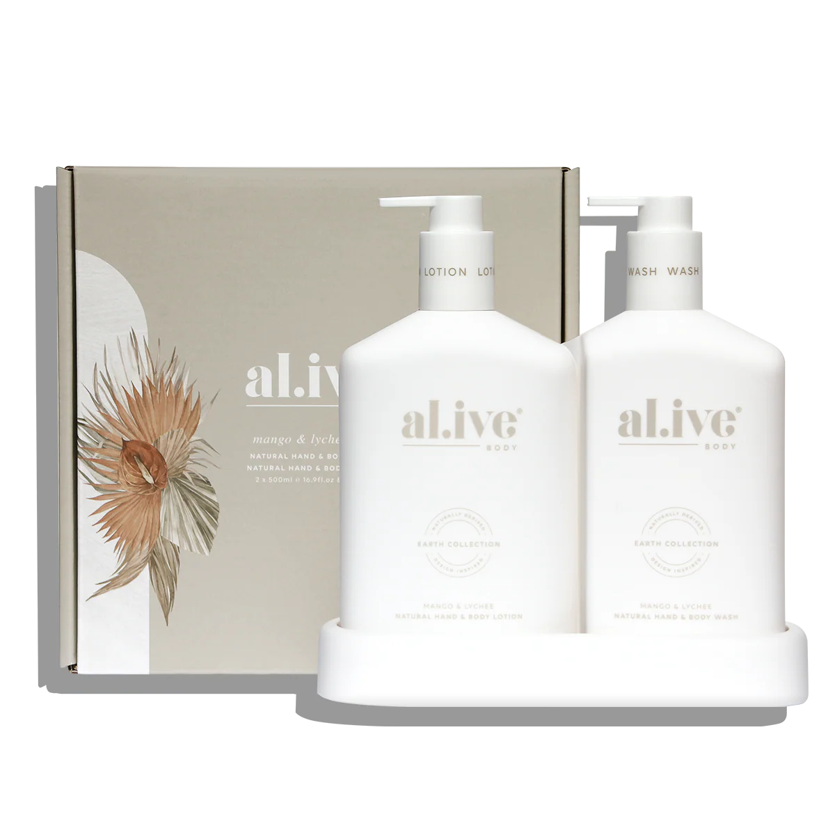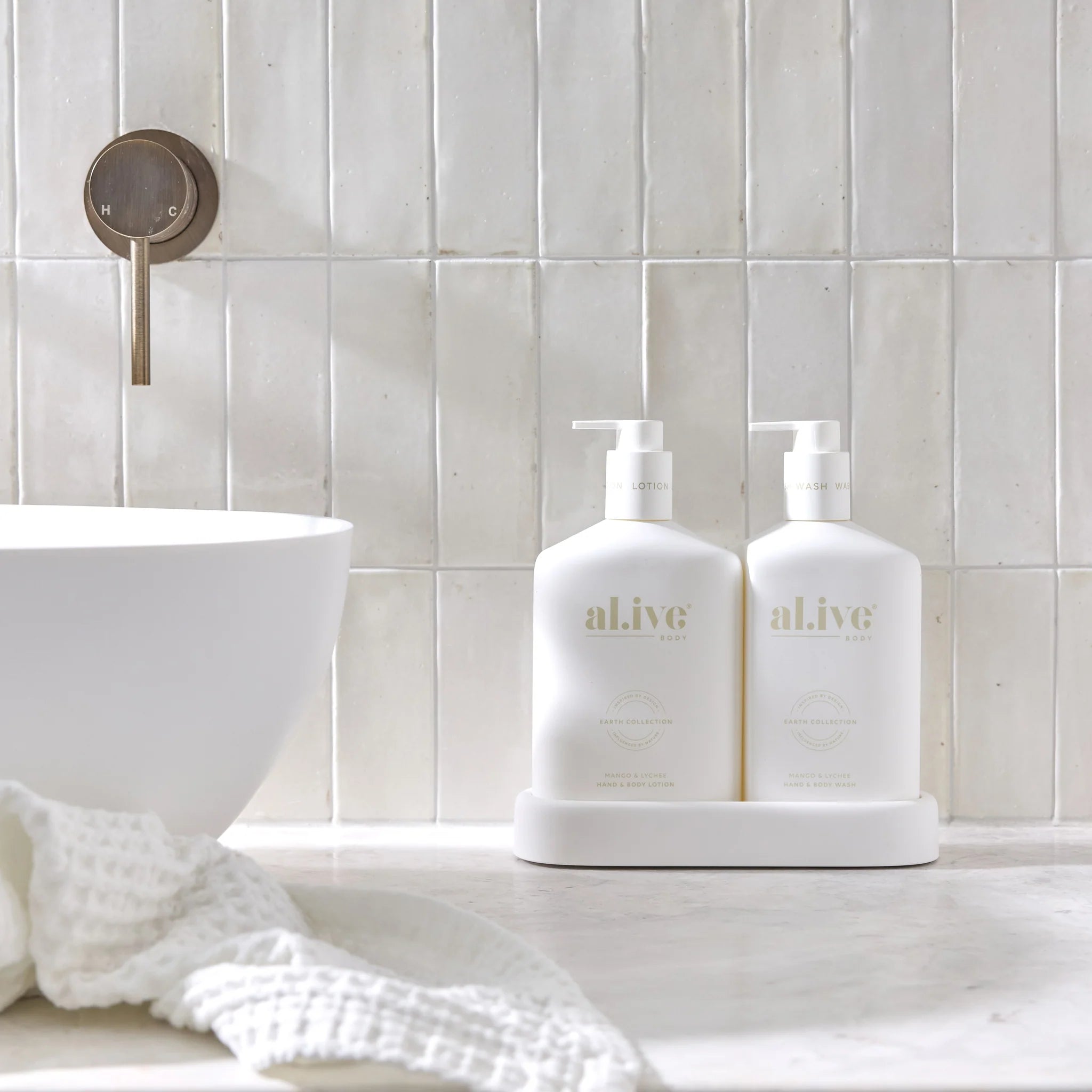 The Duo includes a 500ml hand & body wash, 500ml hand & body lotion and a matching tray.