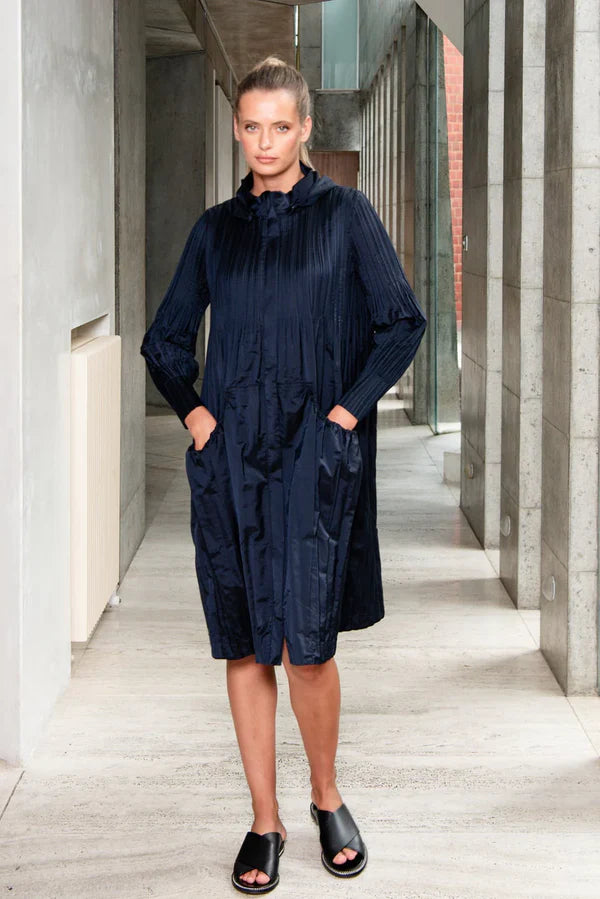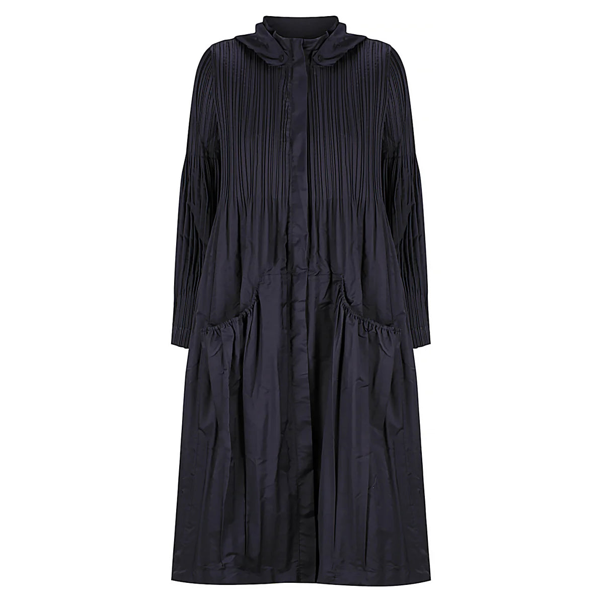 With a pleated detachable hood and pockets, this Windbreaker will be your windy day favourite. A straight pleat throughout the arms and bodice that softens as it descends allowing for a stylish flow of fabric.