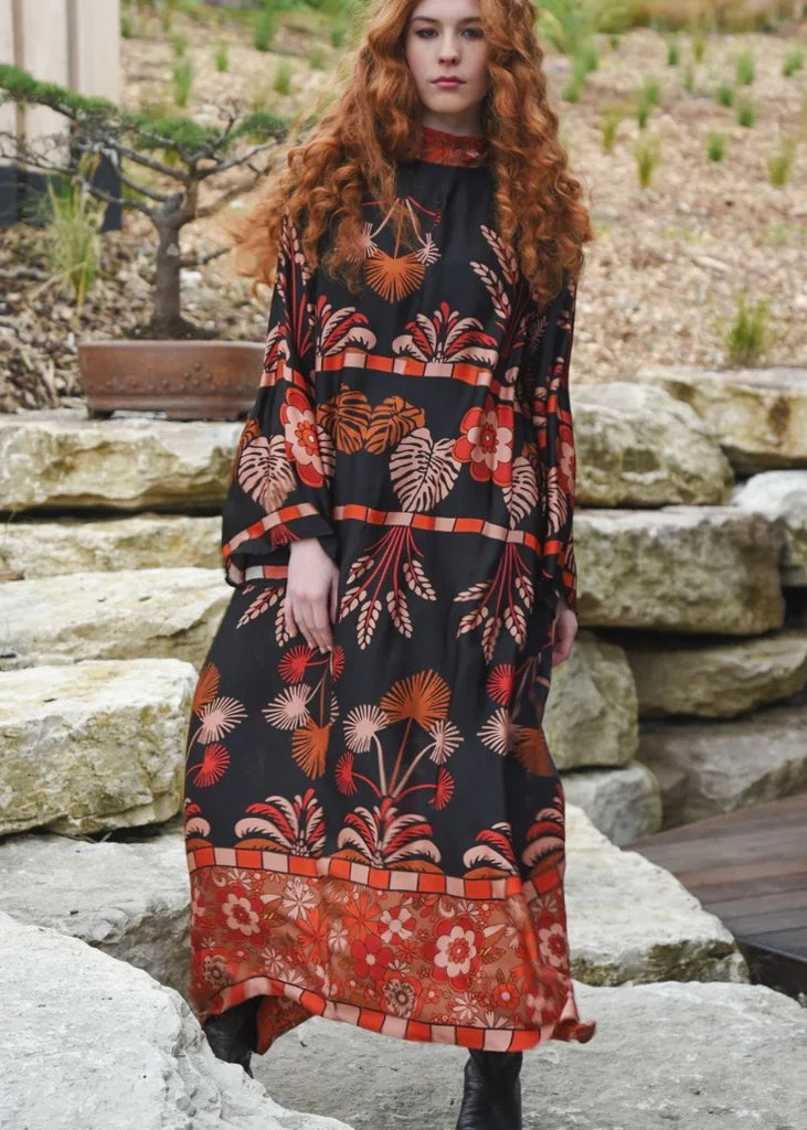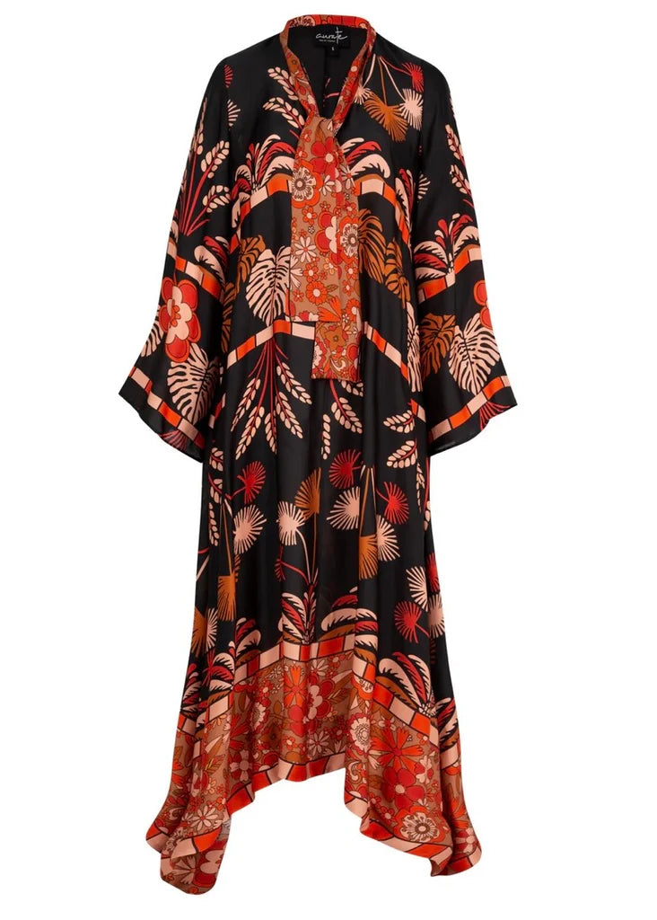 Crafted for true versatility, the 'Little Swish Sunshine' dress is designed to be worn back-to-front, giving you two effortlessly different looks in a single piece. Cut in the black-based autumnal florals of our 'Brown of Thorns' viscose satin, it floats with soft ease, framed by a V-neckline with a pussy-bow tie, flared sleeves, and a sweeping handkerchief hem. With the added ease of side pockets, it’s a dress that moves and adapts with you.