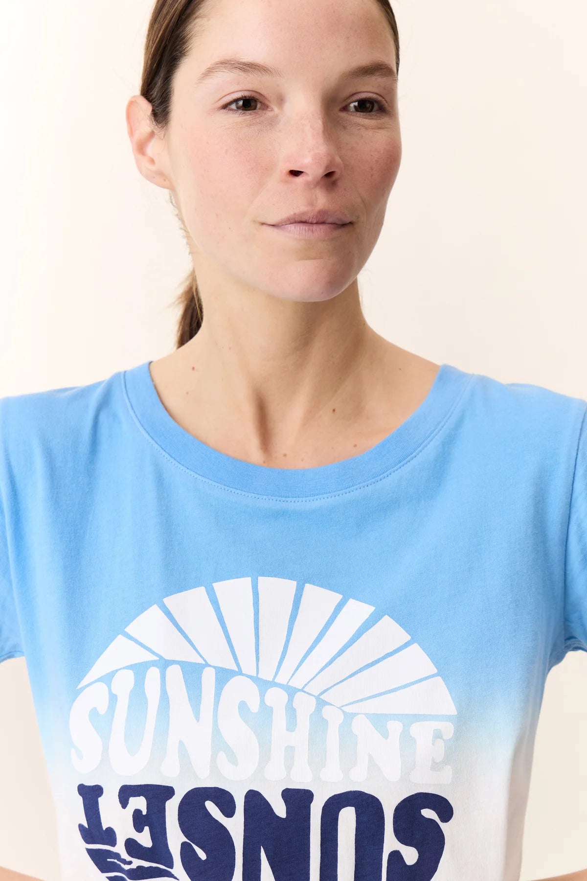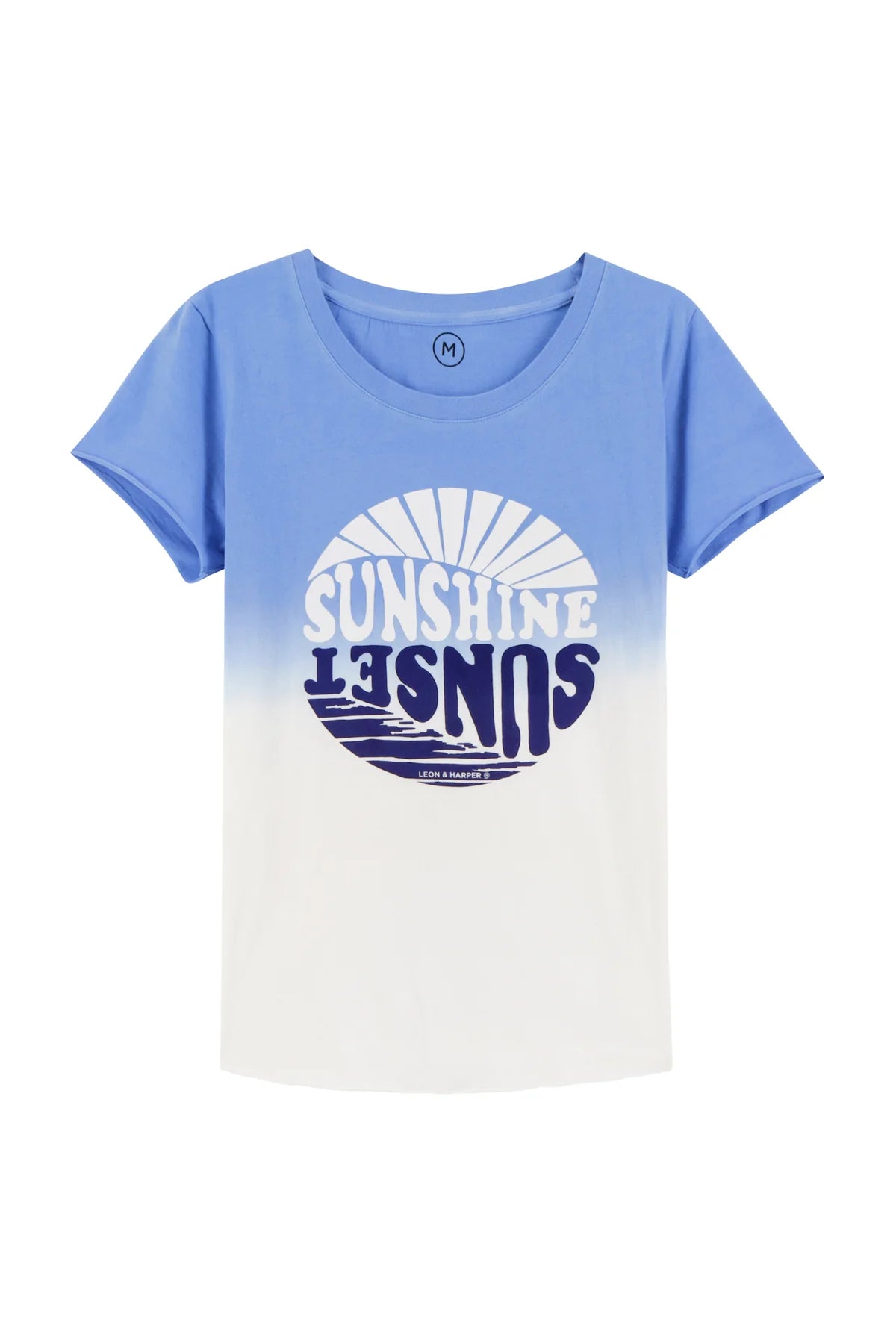 The Toro Sunset T-shirt is reminiscent of summer with its azure sky and golden beaches. A color gradient conjures days that stretch into the sunset, while a retro style print plays with light and reflections. Perfect for adding a casual touch to a summer look. The Leon & Harper woman will pair this T-shirt with denim shorts or flowing pants to show off her carefree spirit.
