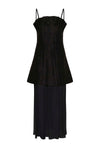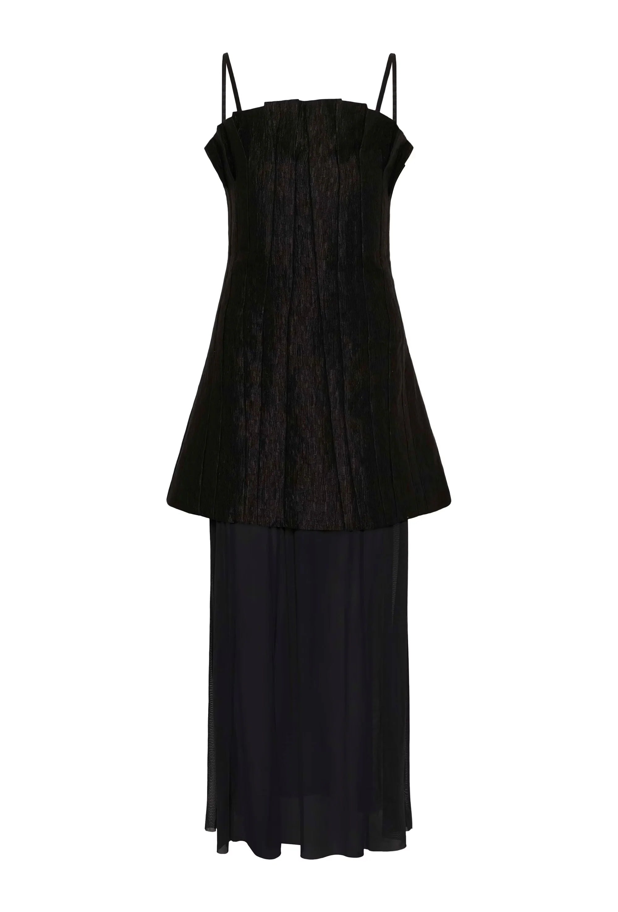 Long dress with thin straps, pleated bodice, and sheer skirt. Designed with beautiful details, making it perfect for the season’s special occasions.