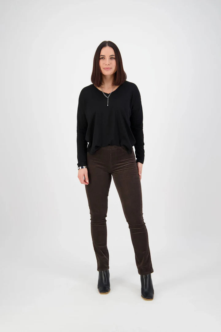 Full-length slim pant in a soft stretch pinwale cord, designed in our Slate colour — a deep, versatile dark blue. With an easy pull-on design and elasticated waistband, this pant creates a smooth, flattering silhouette and includes refined finishing touches like a faux fly, faux front pockets, and back patch pockets.