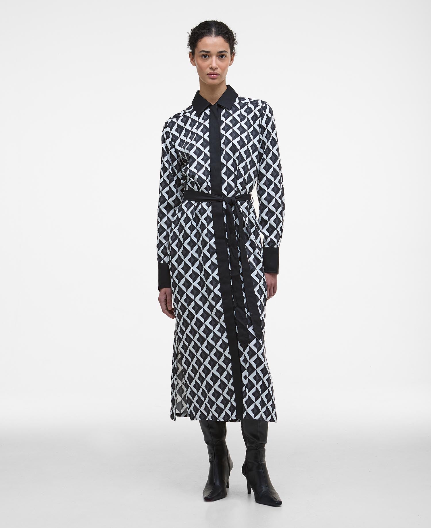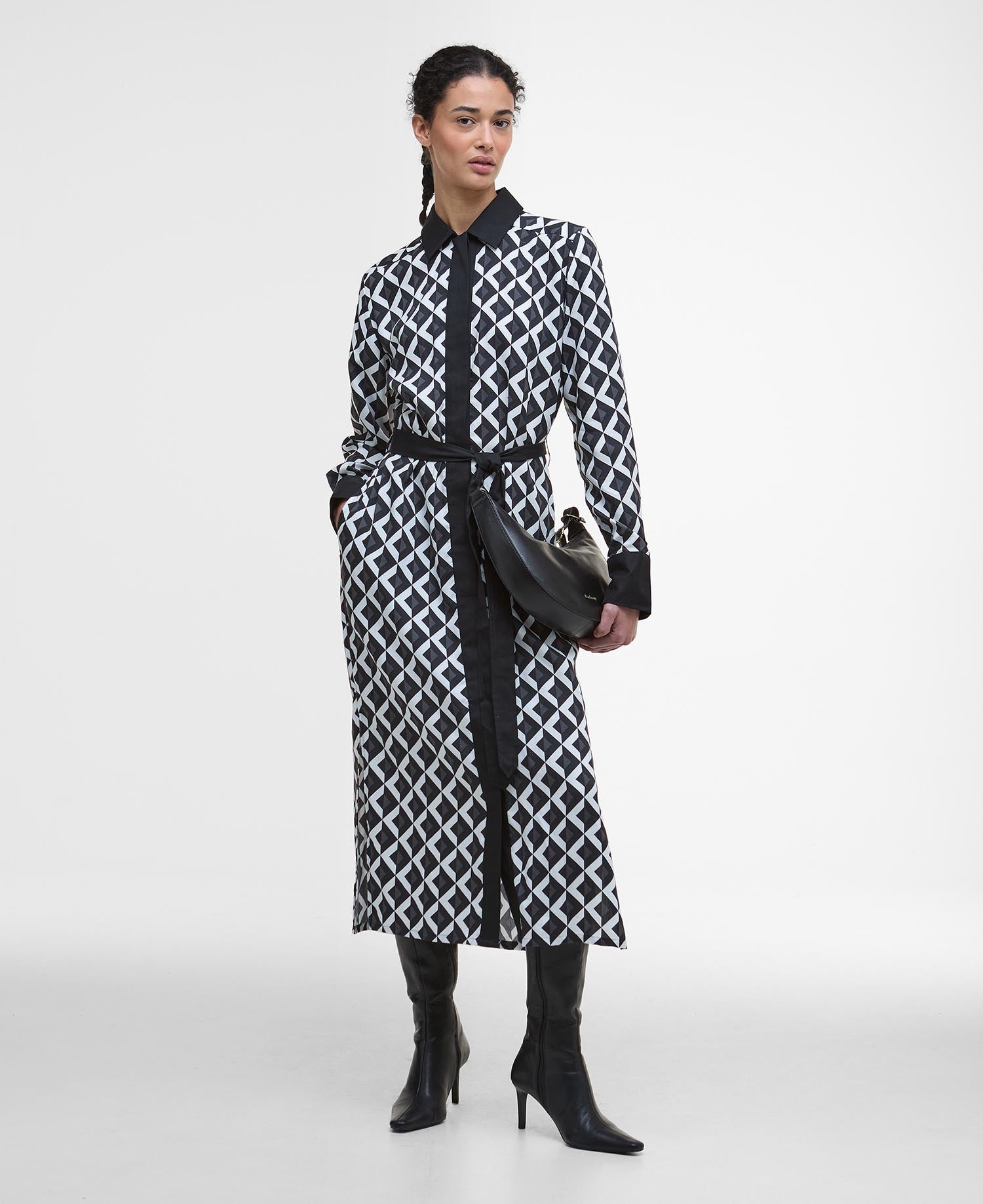 Effortless style and flattering comfort combine in the women's Barbour Demi Midi Dress. Crafted from a smooth lyocell fabric in a striking geo print, this fit-and-flare shirt dress drapes beautifully for a comfortable and stylish silhouette. The contrasting collar, placket, cuffs, and adjustable belt add a touch of sophisticated detail and allow you to cinch the waist for a personalised fit. The breathable and lightweight feel of the lyocell fabric is perfect for comfortable wear throughout the milder seasons. The midi length offers versatile styling, making it ideal for both smart-casual occasions and everyday elegance. A discreet slim ID bar at the back neck signifies the quality of the Barbour brand. Embrace effortless chic and comfortable wear with this must-have midi dress.